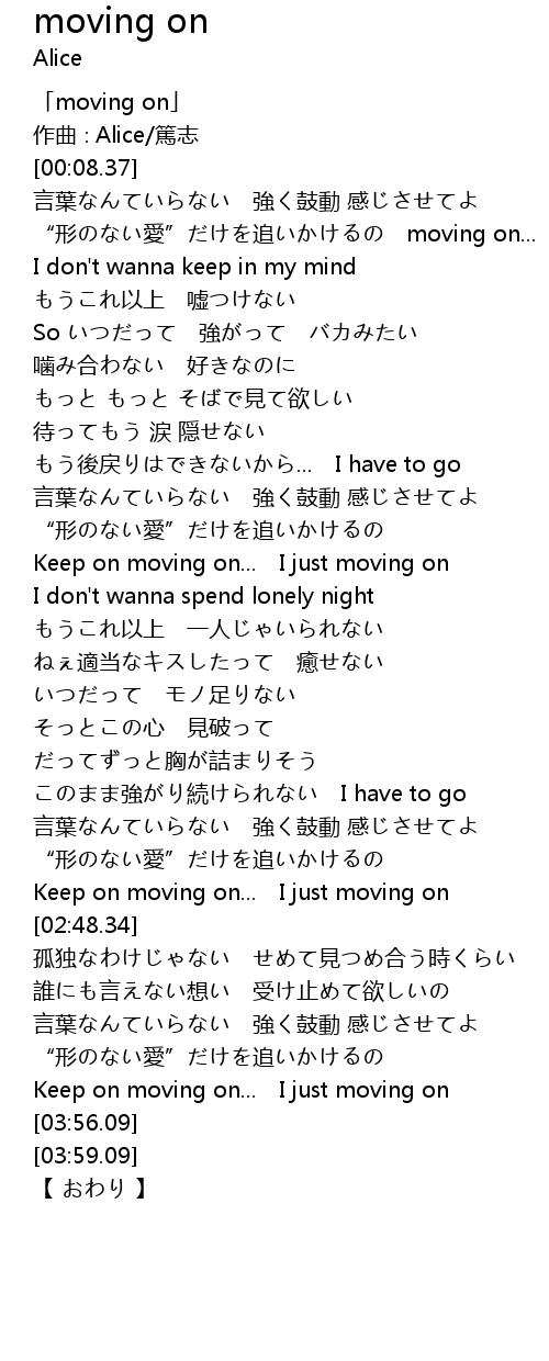 | [00:20.60] | “形のない愛”だけを追いかけるの moving on... |