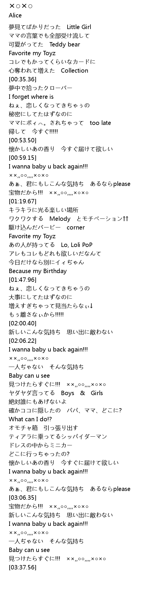 | [02:19.77] | 見つけたらすぐに!!! ××,,○○,,,,×○×○ |