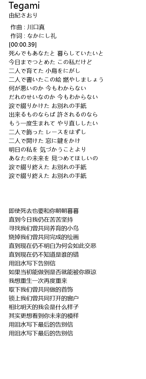 | [02:31.15] | 涙で綴り終えた お別れの手紙 |
