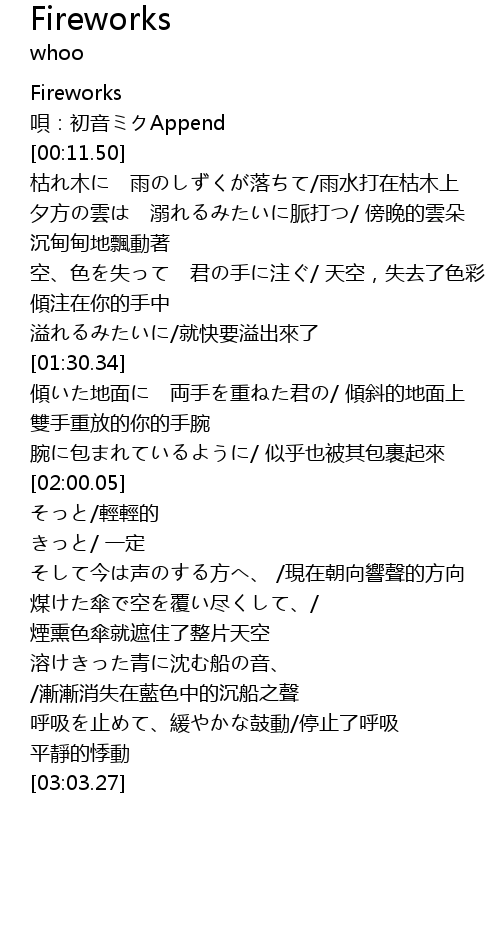| [02:55.05] | 呼吸を止めて、緩やかな鼓動/停止了呼吸 平靜的悸動 |