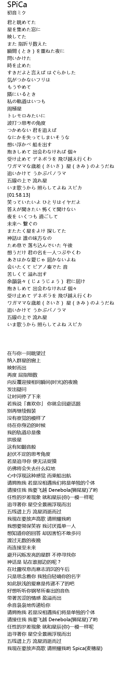 | [01:53.96] | いま歌うから 照らしてよね スピカ |