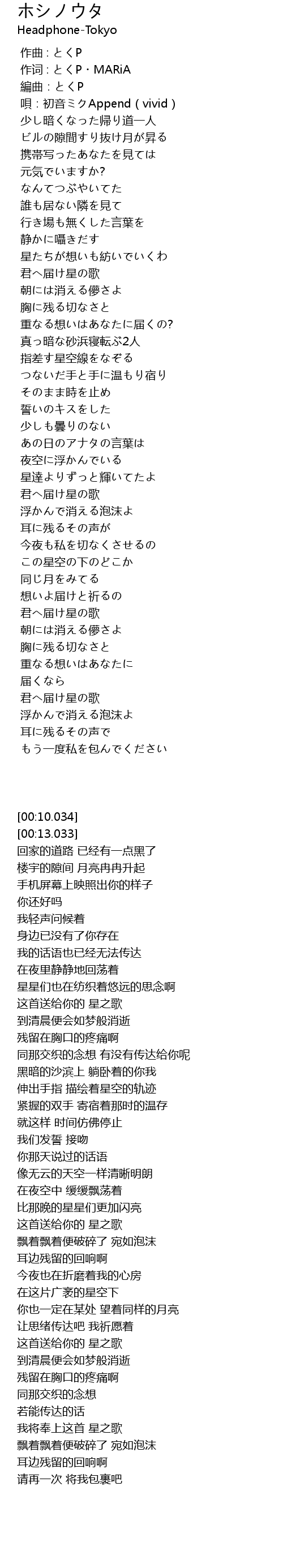 | [00:13.033] | 唄:初音ミクAppend(vivid) |