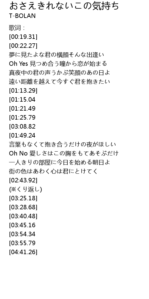 | [02:45.63][01:15.04] | ※おさえきれないこの気持ち |