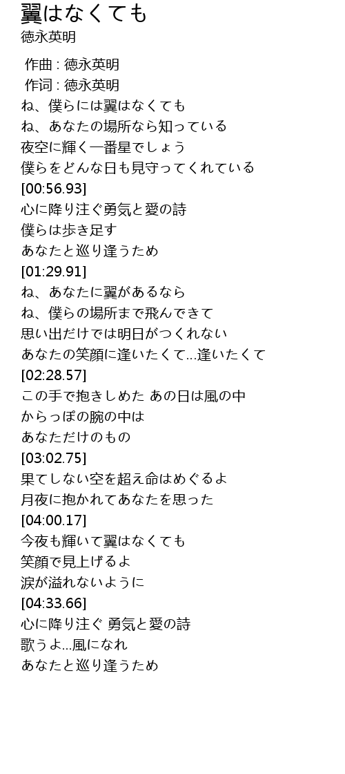 | [04:01.58] | 今夜も輝いて翼はなくても |