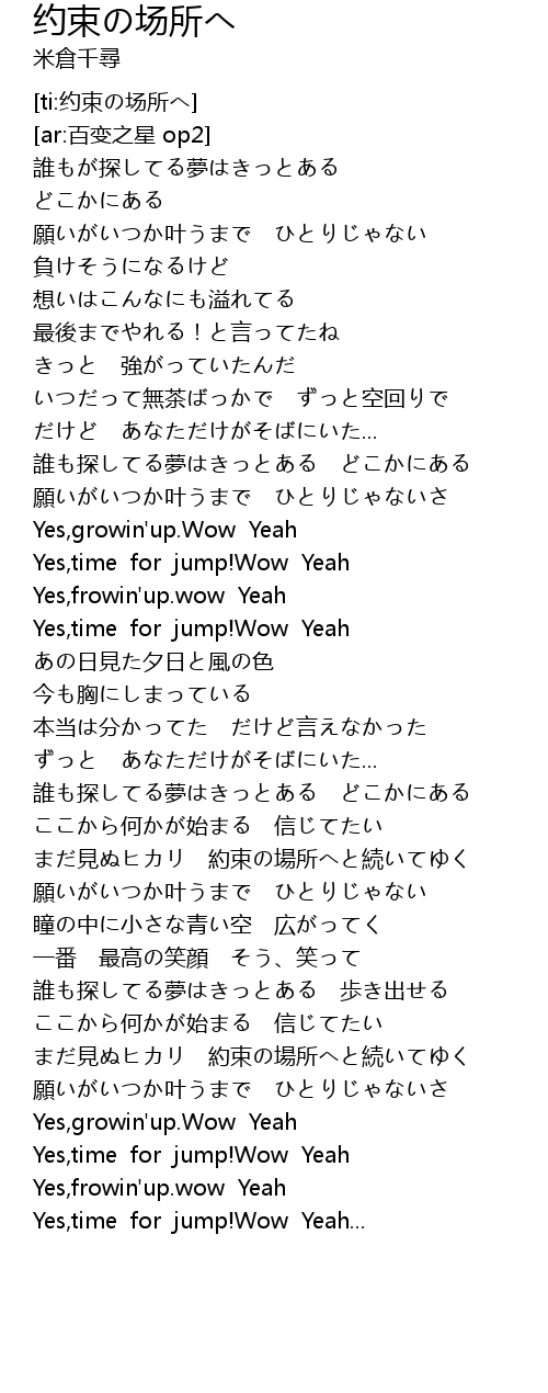 | [02:23.774] | まだ見ぬヒカリ 約束の場所へと続いてゆく |