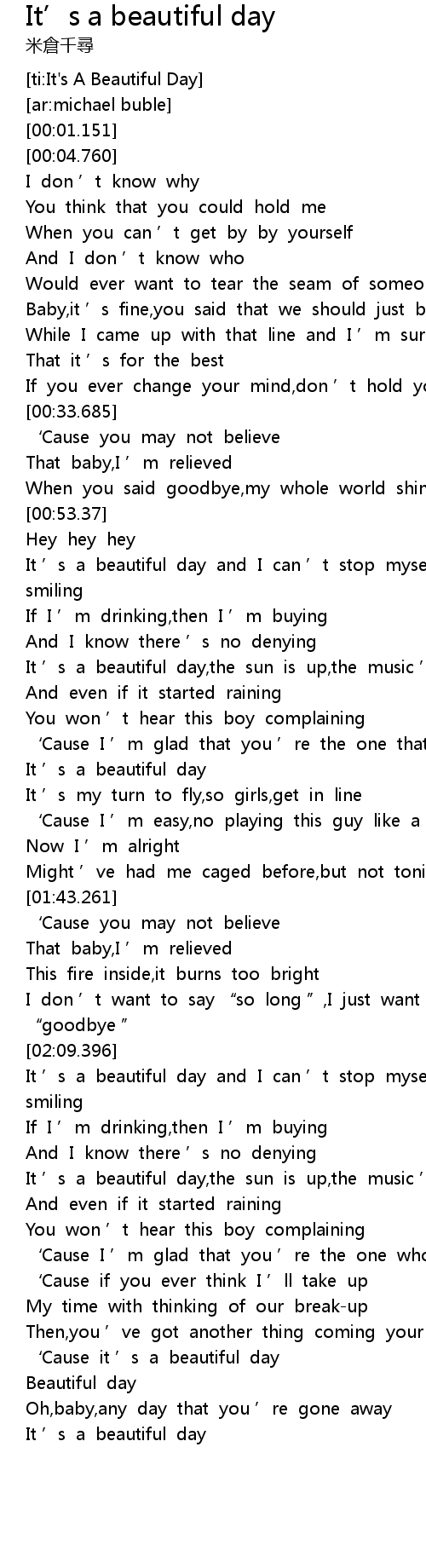 | [02:55.465] | ' Cause it ' s a beautiful day |