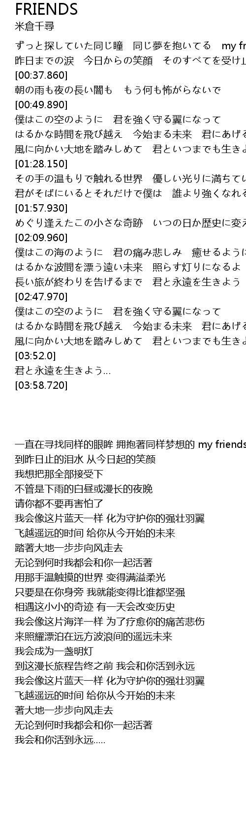 | [00:13.640] | ずっと探していた同じ瞳 同じ夢を抱いてる my friends |