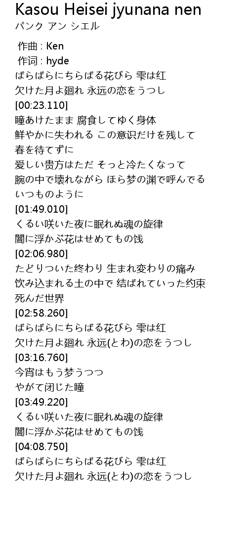 | [04:18.950] | 欠けた月よ廻れ 永远(とわ)の恋をうつし |