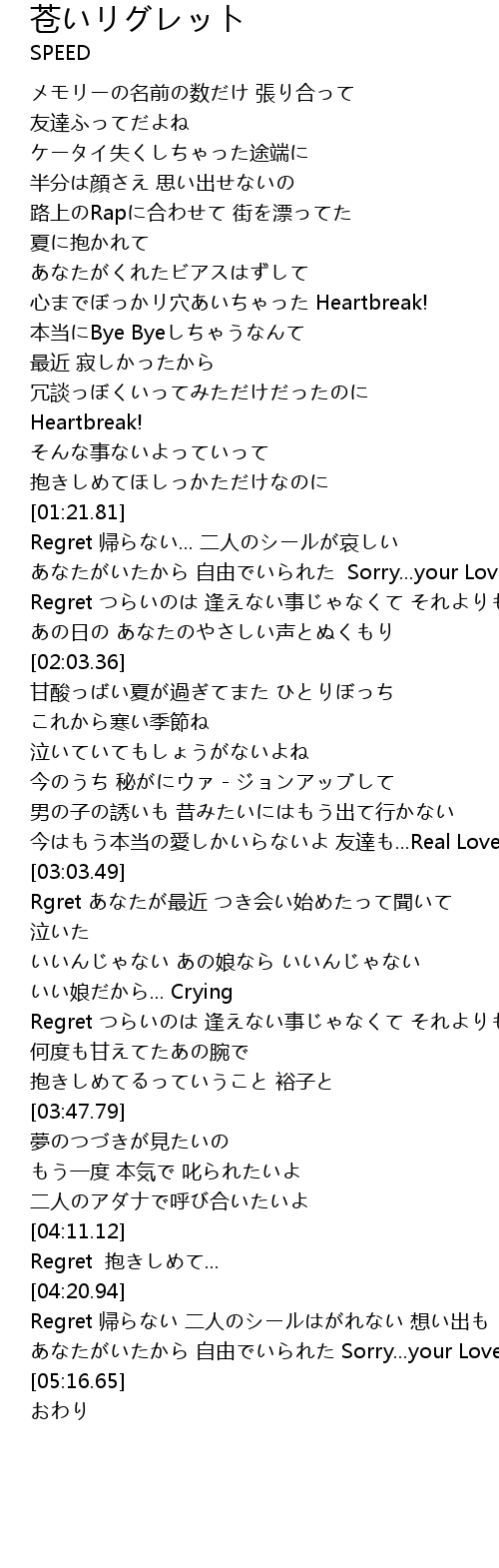 | [03:24.59] | Regret つらいのは 逢えない事じゃなくて それよりも |