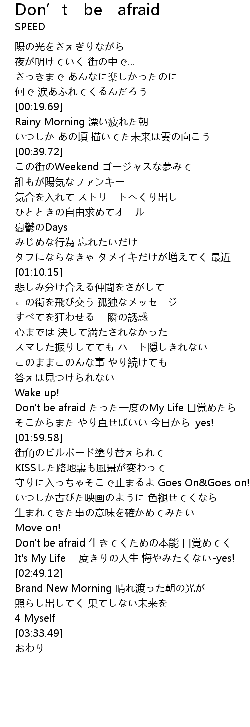 | [01:39.85] | Don't be afraid たった一度のMy Life 目覚めたら |