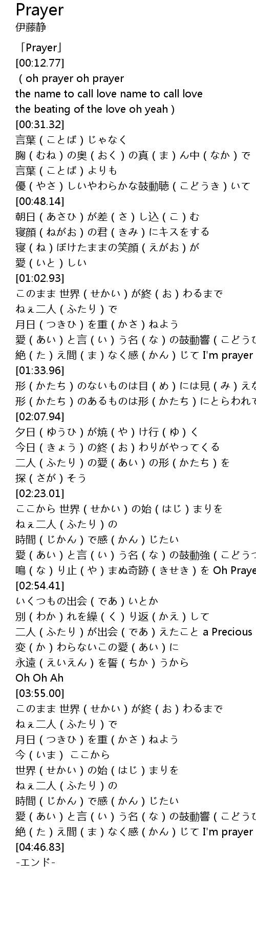 | [02:45.39] | 鳴(な)り止(や)まぬ奇跡(きせき)を Oh Prayer |