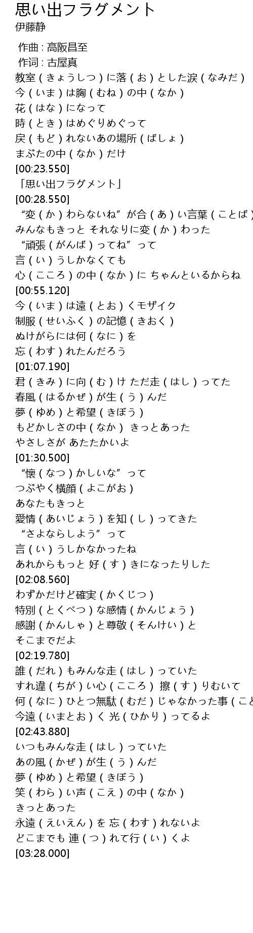 | [00:55.700] | 今(いま)は遠(とお)くモザイク 制服(せいふく)の記憶(きおく) |
