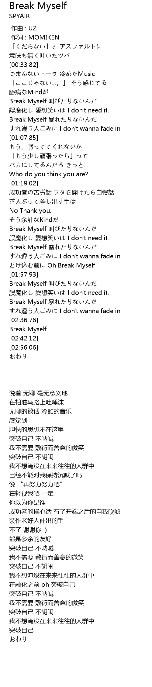 | [00:57.30] | Break Myself 暴れたりないんだ |