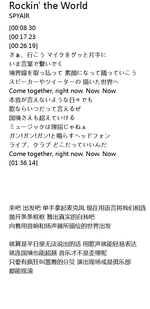 | [01:18.42][00:08.30] | Rockin' the World!! Hey Boys!! Say Wow Wow Wow |
