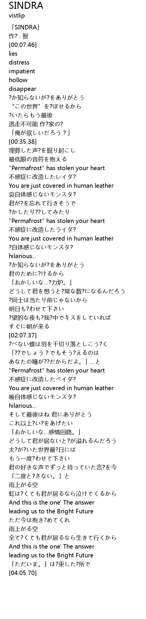 | [02:23.65] | ?べない蝶は羽を千切り落としこう?く |