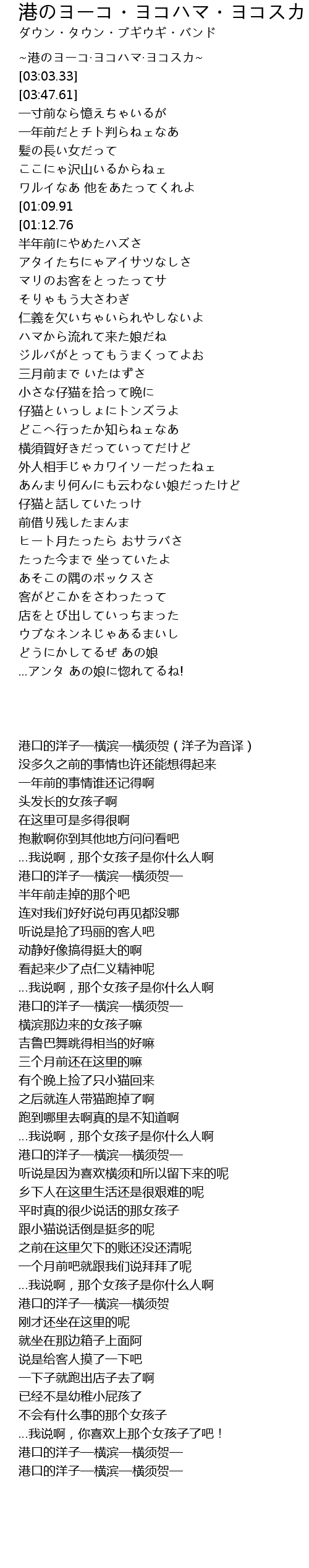 | [00:39.53][01:12.76][01:51.13][02:57.47][03:34.20][03:41.21] | <港のヨーコ·ヨコハマ·ヨコスカ> |