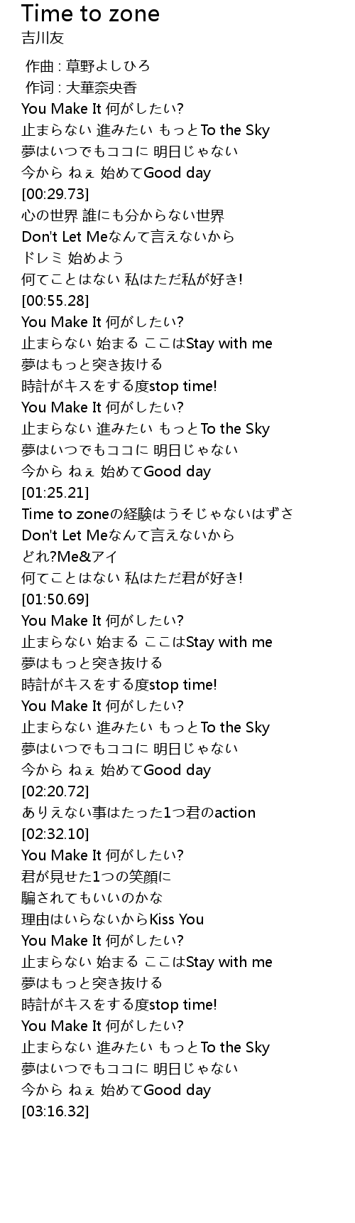 | [01:32.84] | Time to zoneの経験はうそじゃないはずさ |