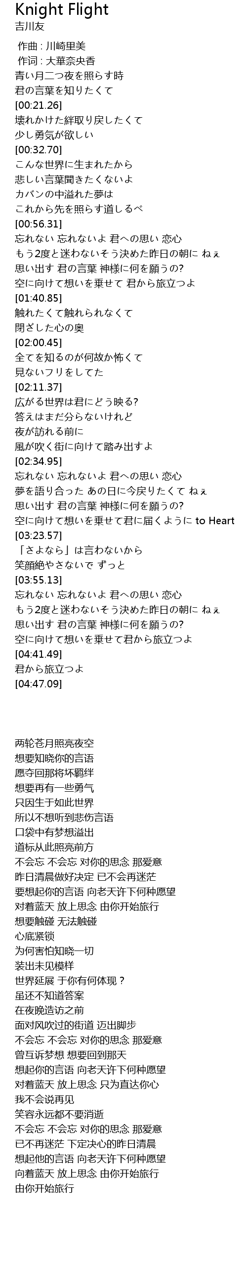 | [03:08.64] | 空に向けて想いを乗せて君に届くように to Heart |
