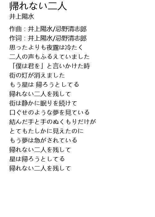 | [02:30.85] | 帰れない二人を残して |