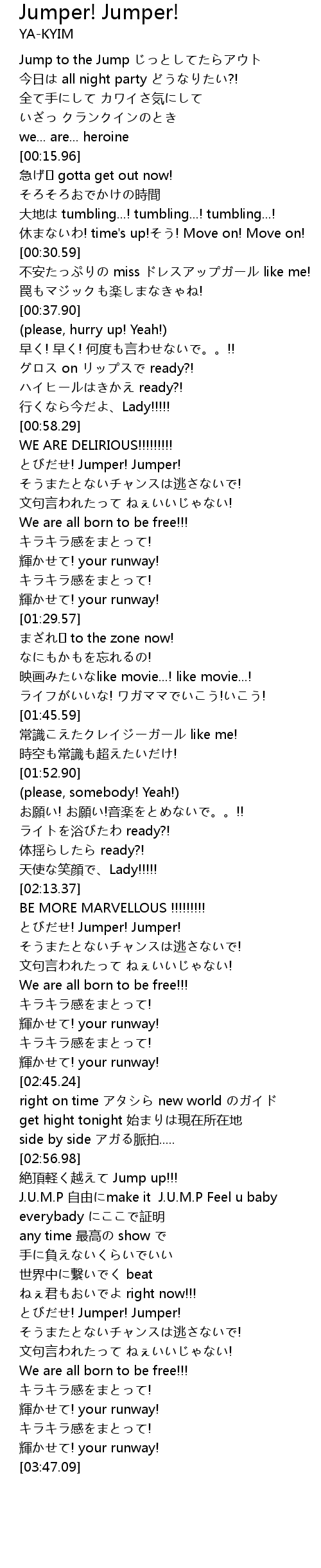 | [02:58.81] | jué dǐng zhì yuè Jump up!!! |