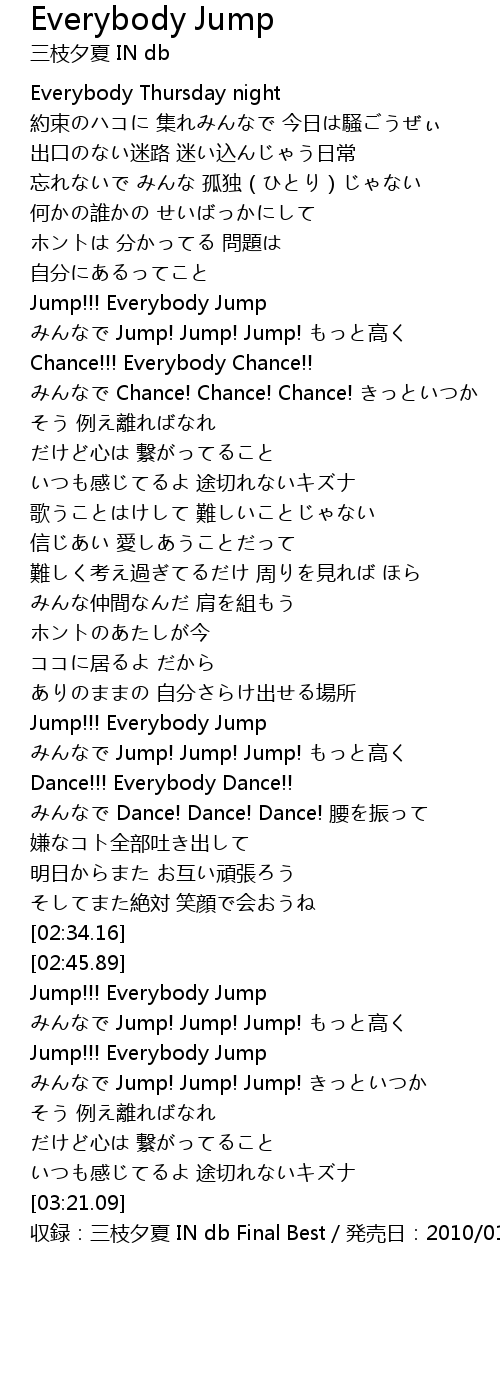 | [02:51.73] | みんなで Jump! Jump! Jump! もっと高く |