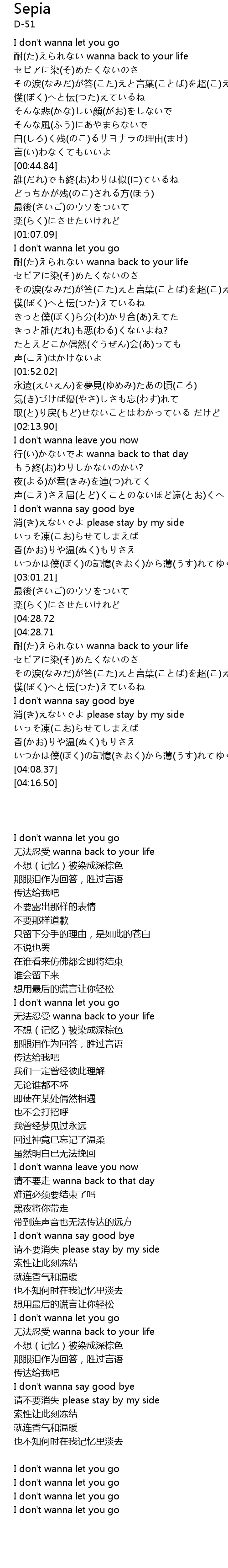 | [04:40.05][04:28.71][04:17.40][03:22.01] | I don't wanna let you go |