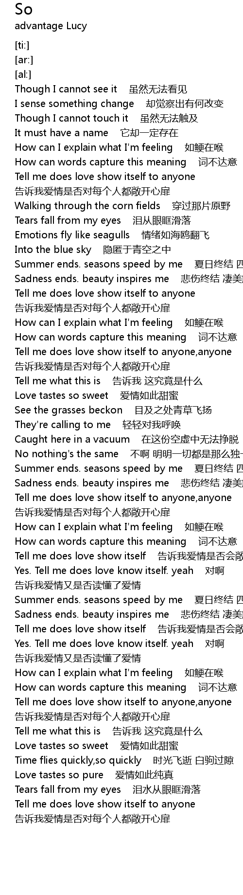 | [03:27.45] | Yes. Tell me does love know itself. yeah duì a gào sù wǒ ài qíng yòu shì fǒu dú dǒng le ài qíng |