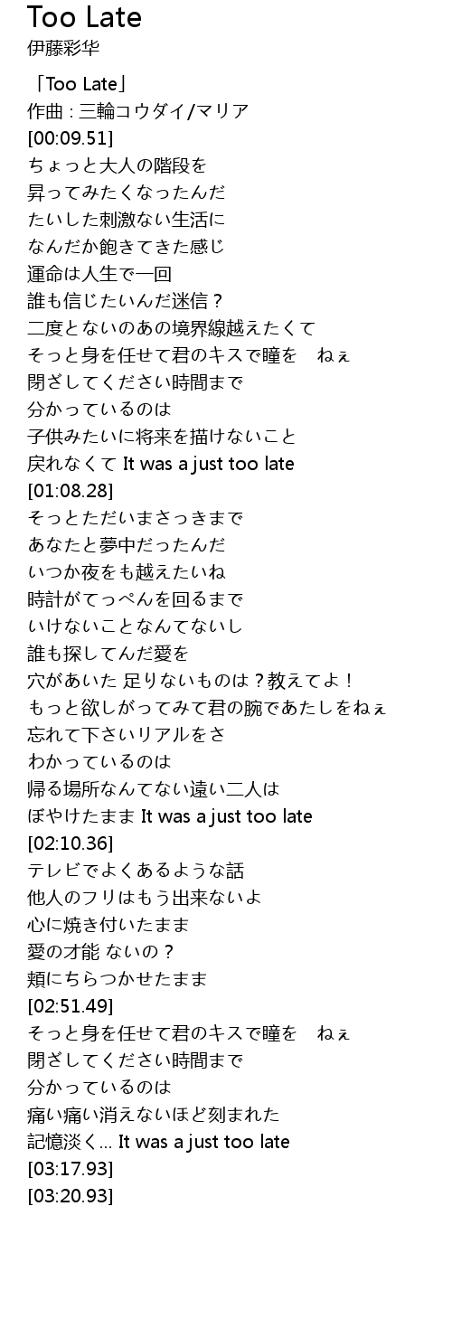 | [03:14.07] | jì yì dàn... It was a just too late |