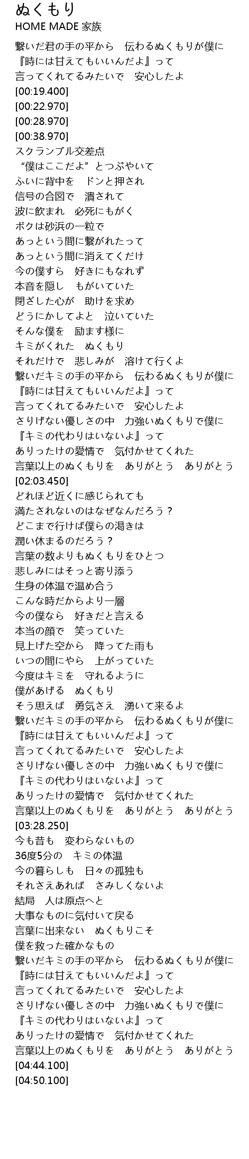 | [03:52.829] | 言葉に出来ない ぬくもりこそ |