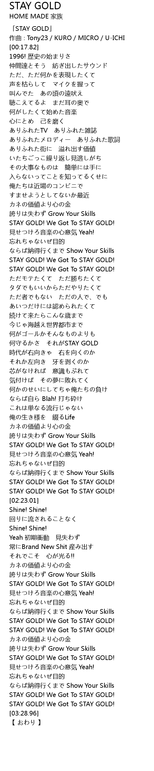 | [01:39.74] | 何守るかさ それがSTAY GOLD |