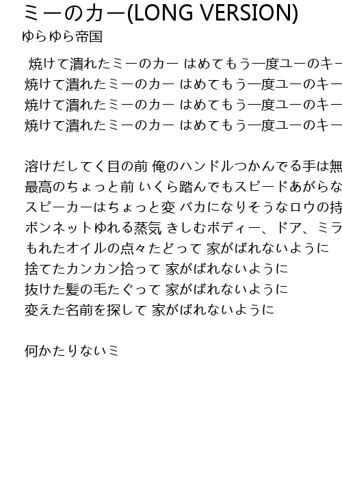 | 焼けて潰れたミーのカー はめてもう一度ユーのキー | |