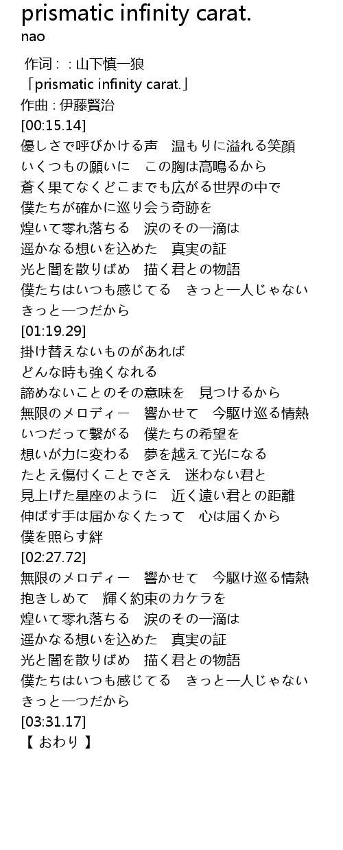 | [00:01.14] | 「prismatic infinity carat.」 |