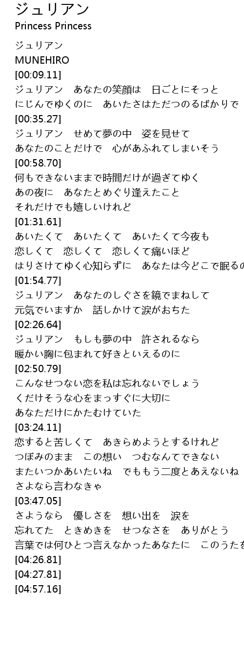 | [00:13.91] | ジュリアン あなたの笑顔は 日ごとにそっと |