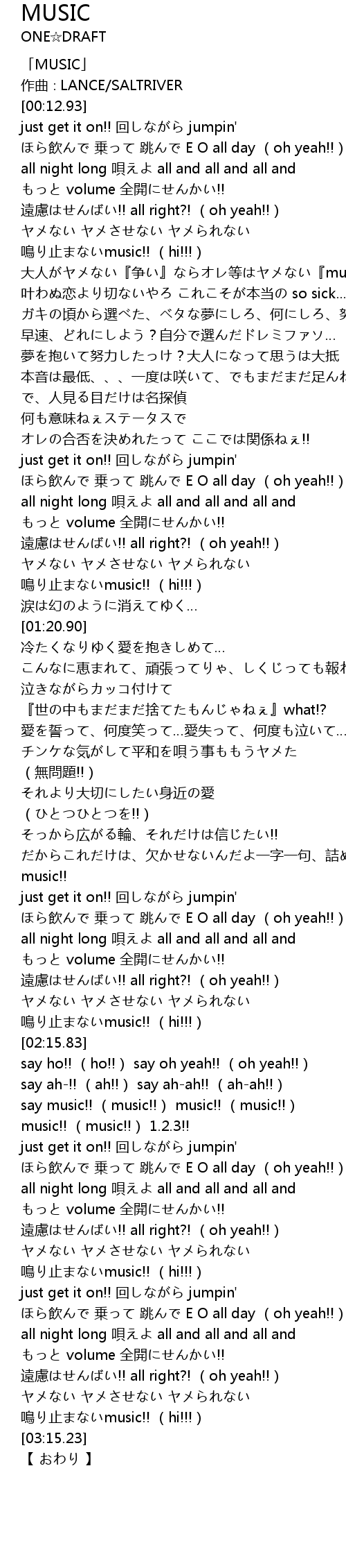| [01:13.62] | 鳴り止まないmusic!! (hi!!!) |