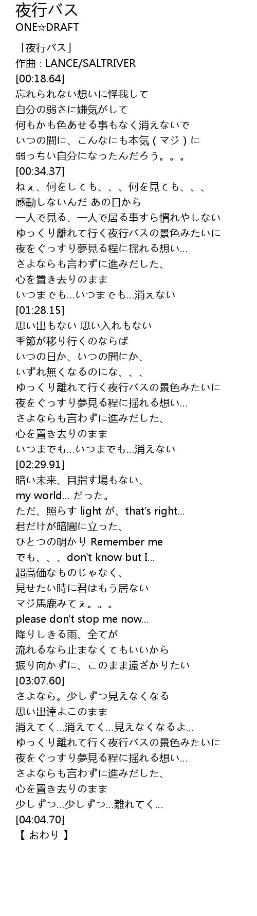 | [00:55.92] | ゆっくり離れて行く夜行バスの景色みたいに |