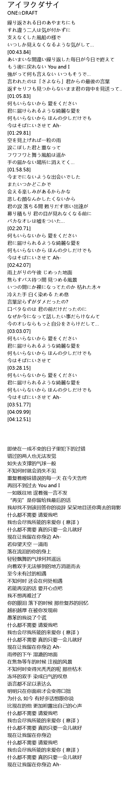 | [00:43.86] | あいまいな間違い繰り返した毎日が今日で終えて |