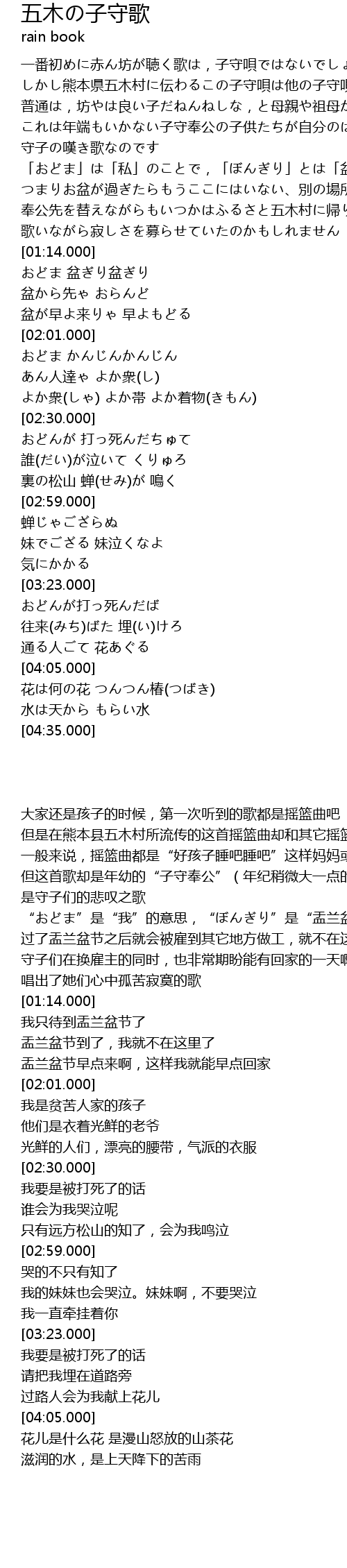 | [00:30.000] | これは年端もいかない子守奉公の子供たちが自分のはかないさだめを歌いながら子供たちを寝かしつける時に歌う |