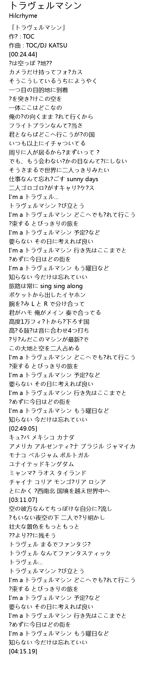 | [03:44.92] | I'm a トラヴェルマシン どこへでも?れて行こう |