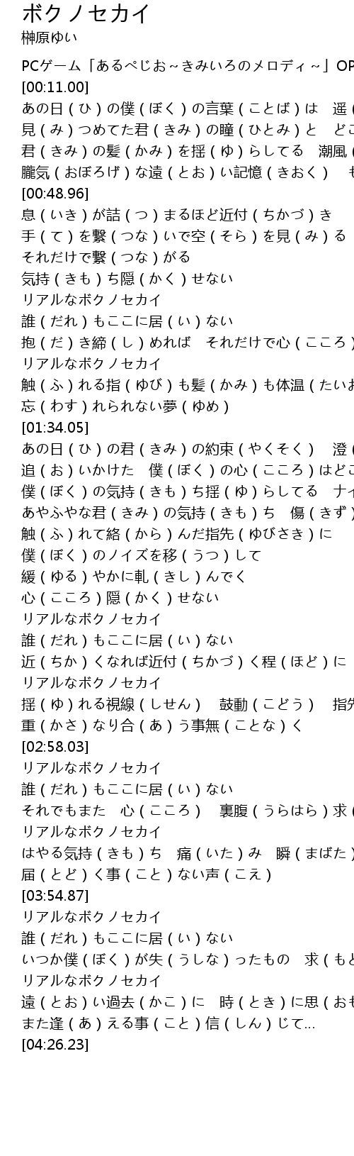 | [00:08.00] | PCゲーム「あるぺじお~きみいろのメロディ~」OP |