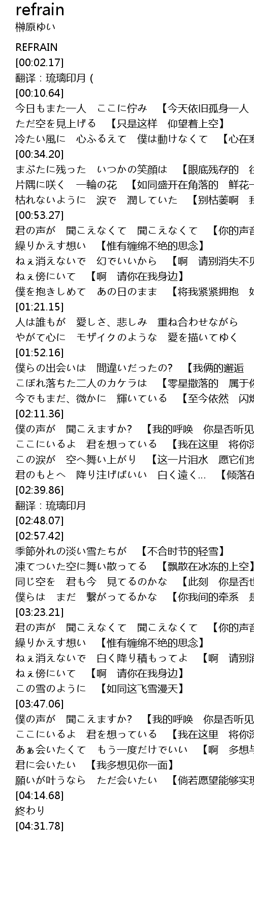 | [02:29.25] | 君のもとへ 降り注げばいい 白く遠く… 【倾落在 你的眼前 洁白而邈远…】 |