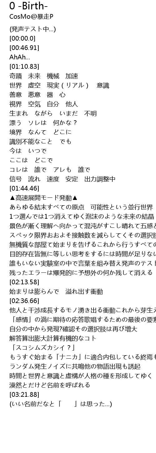 | [02:07.80] | 誰もいない実験室の中で言葉を組み替え発声のテスト |