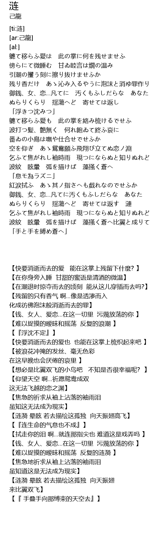 | [03:58.22] | 波紋 眩暈 弧を描けば 藻掻く蒼へ比翼と成りて |