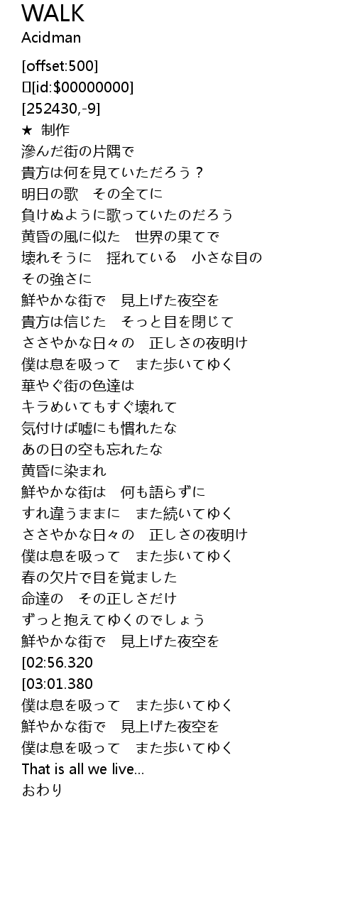 | [02:20.120] | 僕は息を吸って また歩いてゆく |