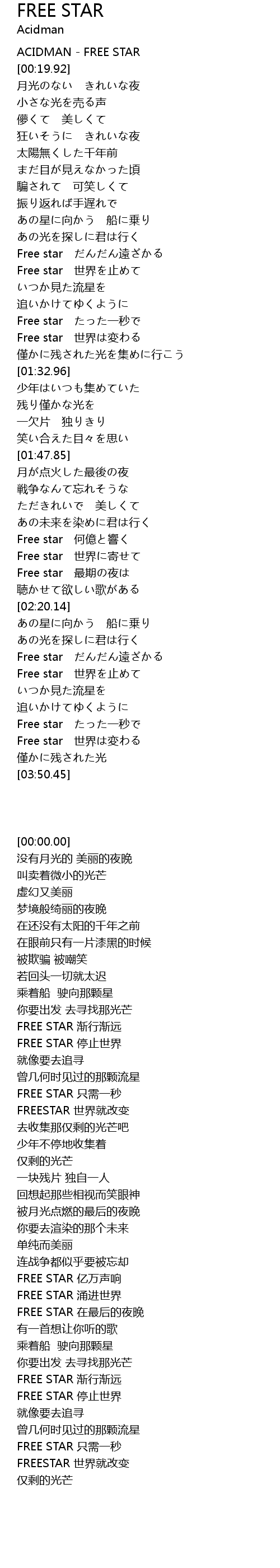 | [00:00.00] | ACIDMAN - FREE STAR |