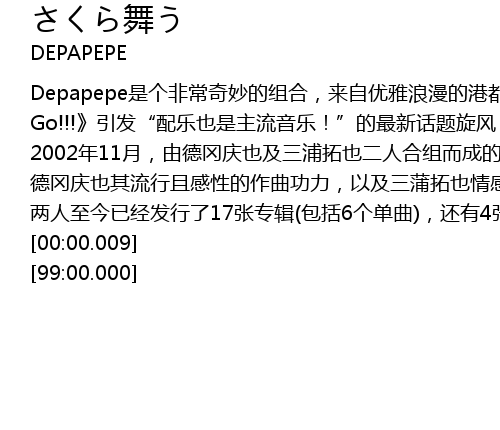 | [00:56.34] | 2002 nian 11 yue, you de gang qing ye ji san pu ta ye er ren he zu er cheng de DEPAPEPE, jin yi er ba kong xin ji ta jiu neng biao xian chu bian hua duo duan di xin xiang feng jing yi ji xi nu ai yue, yi yang yi zhe qing chun qi xi de qing kuai qu feng xuan lv, tan zou chu shu huan ren xin de yin yue kong jian, ru ci yi ji ta ge chang de xiao ying zheng zai xun su man yan kuo san zhong! cong shen hu dao da ban jing du yi ji dong jing, sui zhe jie tou biao yan de jing yan lei ji, DEPAPEPE shun jian kai qi le zhi ming du ji ren qi! |