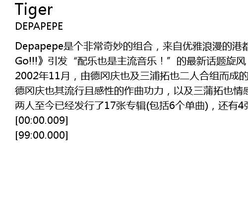 | [02:15.18] | 德冈庆也其流行且感性的作曲功力,以及三蒲拓也情感纤细且大胆的吉它弹奏,DEPAPEPE的组合成为日本乐坛一股跨界的新兴势力!用手指及琴弦歌唱的DEPAPEPE,将用他们音乐里不同趣味风貌的曲调,邀请你一起进入这变幻多彩的吉它的世界! |