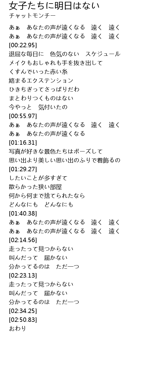 | [02:03.74] | あぁ あなたの声が遠くなる 遠く 遠く |