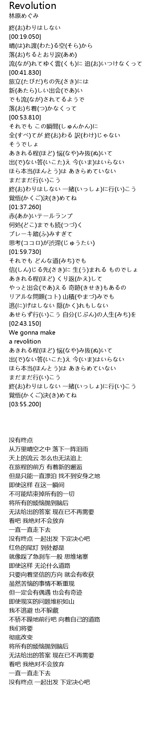 | [03:45.910] | 終(お)わりはしない 一緒(いっしょ)に行(い)こう 覚悟(かくご)決(き)めてね |