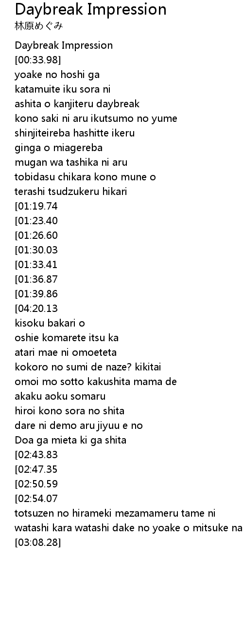 | [00:44.34] | ashita o kanjiteru daybreak |