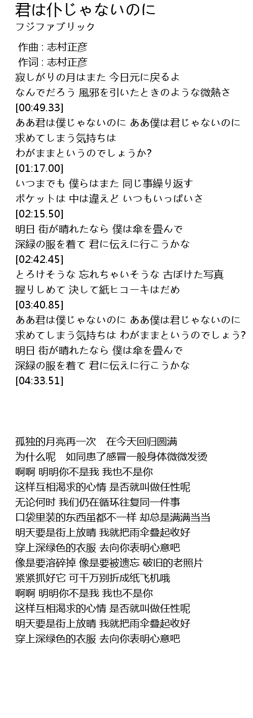 | [03:42.54] | ああ君は僕じゃないのに ああ僕は君じゃないのに |
